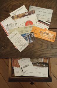 J’en ai beaucoup, presque autant que de livres. Ceux que je préfère sont les anciens billets de train, de musée ou de théâtre car ils partagent mon histoire et que les billets matériels n’existeront bientôt plus.