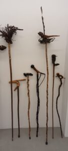 J’ai pris cette photo il y a quelques mois, comme je me promenais dans la galerie d’art brut Christian Berst à Paris. Seanie Barron (et non “Baston”) sculpte depuis plusieurs décennies, pour le plaisir, des branches qu’il ramasse sur un terrain derrière sa maison d’Askeaton, en Irlande. Aujourd’hui retraité, il choisit chaque jour une canne différente pour faire sa promenade rituelle à laquelle il ne déroge jamais, car : “There are two things that can kill you in this life: the electric chair and the armchair.” (Deux choses peuvent vous tuer dans la vie : la chaise électrique et le fauteuil).